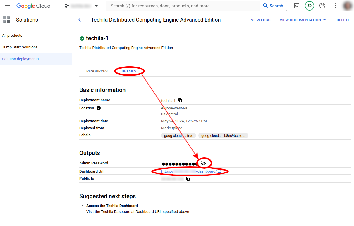 Switch to the Details tab. Then click the eye icon to display the Admin Password. You can then copy the password into the clipboard. Then click on the Dashboard Url link to open the Techila Dashboard login page.